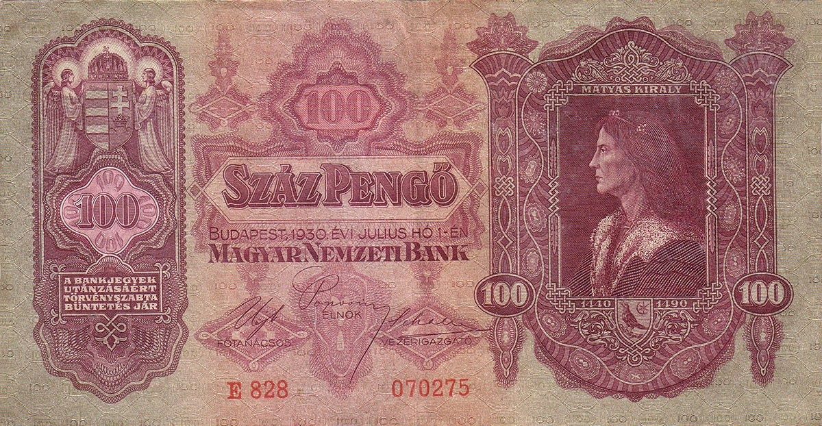 Пенгё — денежная единица Венгрии в период с 1927 по 1946 года. 1 пенгё = 100 филлерам. Название валюты переводится как "звонкий" видимо из-за ассоциаций с XVII-XVIII веками, когда крупные серебряные монеты собирательно именовали "звонкими". Данная банкнота выпущена в 1930 г., в Королевстве Венгрия (1920—1946) которая была под управлением регента Миклоша Хорти при фактическом упразднении в стране монархии. Банкнота была в обращении была с 1932 по 1946.