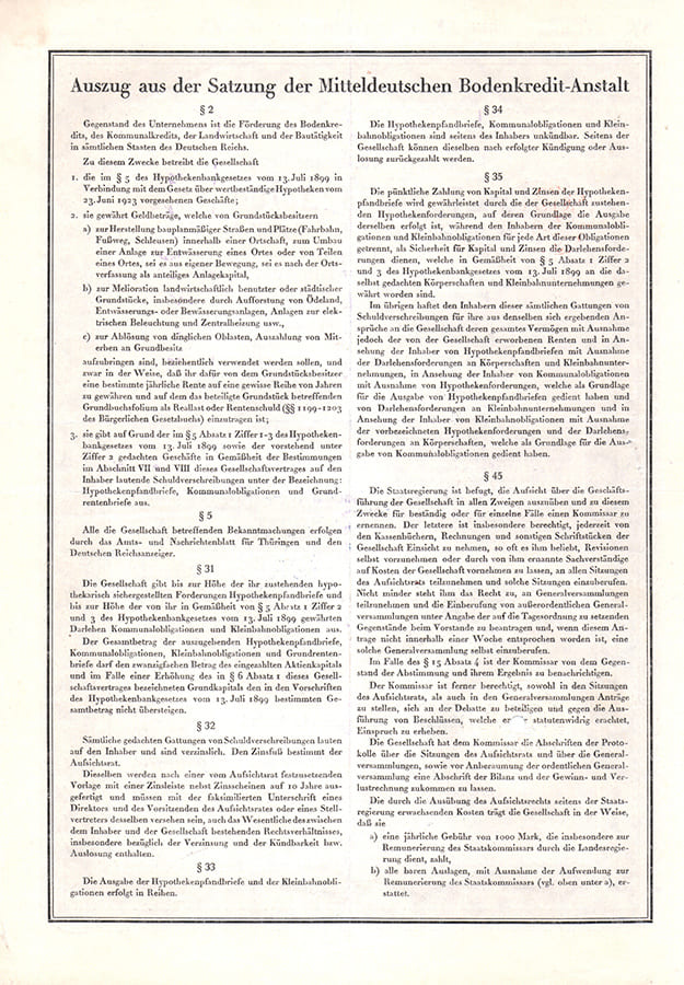 В свое время банк Mitteldeutsche Bodenkredit-Anstalt был одним из крупнейших финансовых учреждений Германии. Основанная в декабре 1895 года, компания сыграла большую роль в облегчении доступа к кредитам для покупки и строительства недвижимости в Германии. Имея штаб-квартиры в Грайце (Greiz) и Берлине, Mitteldeutsche Bodenkredit-Anstalt поддерживала экономический и городской рост в период перемен и развития.